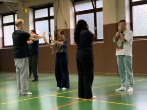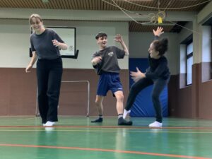 Im Rahmen der Projektwoche fand das Projekt „Körpertheater – Erzieher mit allen Sinnen“ unter der Leitung von Jürgen Rebmann und Damaris Enders statt. Zehn Teilnehmende aus verschiedenen Ausbildungsjahren sowie mit unterschiedlichen Vorerfahrungen und Persönlichkeiten kamen zusammen, um sich auf eine körperliche und kreative Forschungsreise einzulassen. Ziel war es, über nonverbale Kommunikation, Bewegung und Präsenz zentrale Fragen zu Gesellschaft, Gemeinschaft und Individualität zu erforschen.
