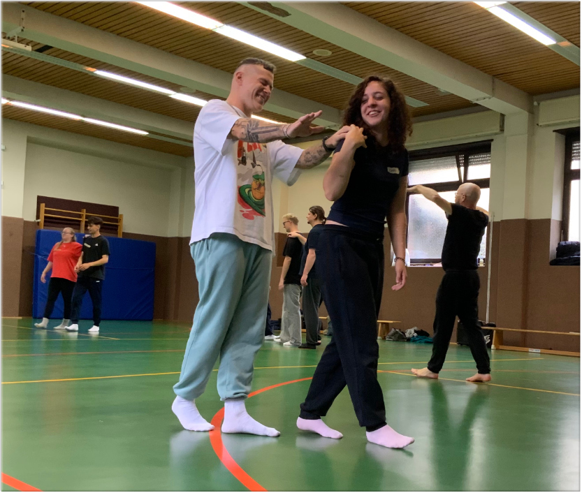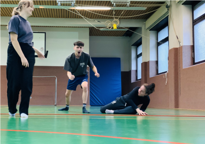 Im Rahmen der Projektwoche fand das Projekt „Körpertheater – Erzieher mit allen Sinnen“ unter der Leitung von Jürgen Rebmann und Damaris Enders statt. Zehn Teilnehmende aus verschiedenen Ausbildungsjahren sowie mit unterschiedlichen Vorerfahrungen und Persönlichkeiten kamen zusammen, um sich auf eine körperliche und kreative Forschungsreise einzulassen. Ziel war es, über nonverbale Kommunikation, Bewegung und Präsenz zentrale Fragen zu Gesellschaft, Gemeinschaft und Individualität zu erforschen.